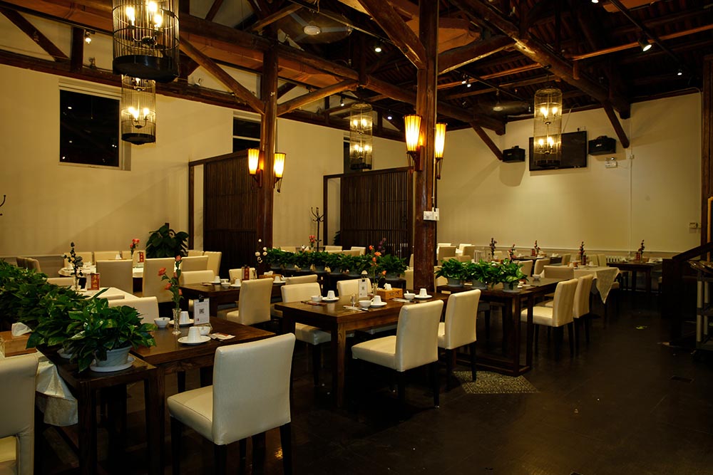 - 二层主要是包间区,运用榆木百叶做成屏风,使整个餐厅充满浓郁的自然风光,